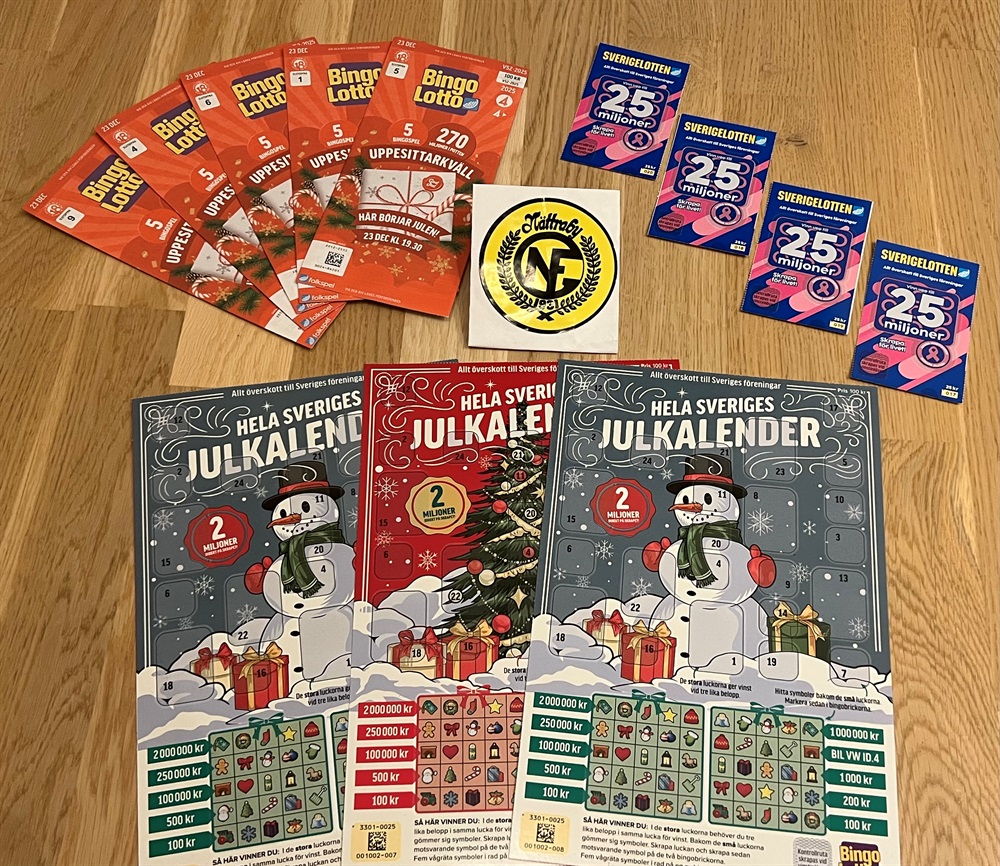 Obligatoriskt är 5 lotter per spelare men vi får sälja hur många lotter vi vill och kan. Vinsten från allt vi säljer utöver de 5 går helt till lagkassan. Vi kan sälja enkellotter och dubbellotter till Uppesittarkvällen 23/12 och till Nyår 31/12 samt Julkalendrar och Sverigelotter rosa bandet. Bäst förtjänst är det på kalendrarna.