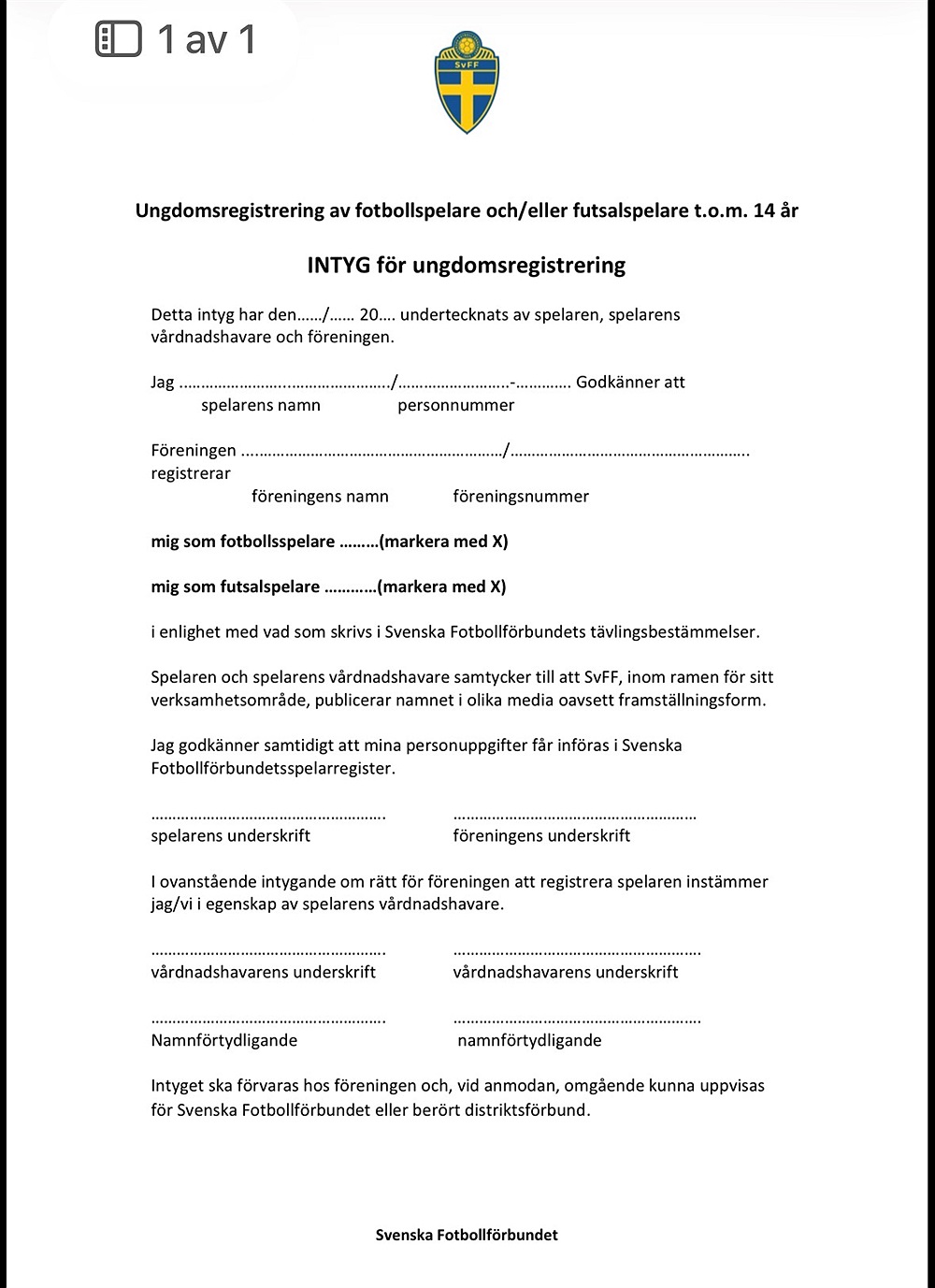 Blekinge fotbollsförbund kräver att alla från och med vår årskull registreras enligt bifogad blankett.